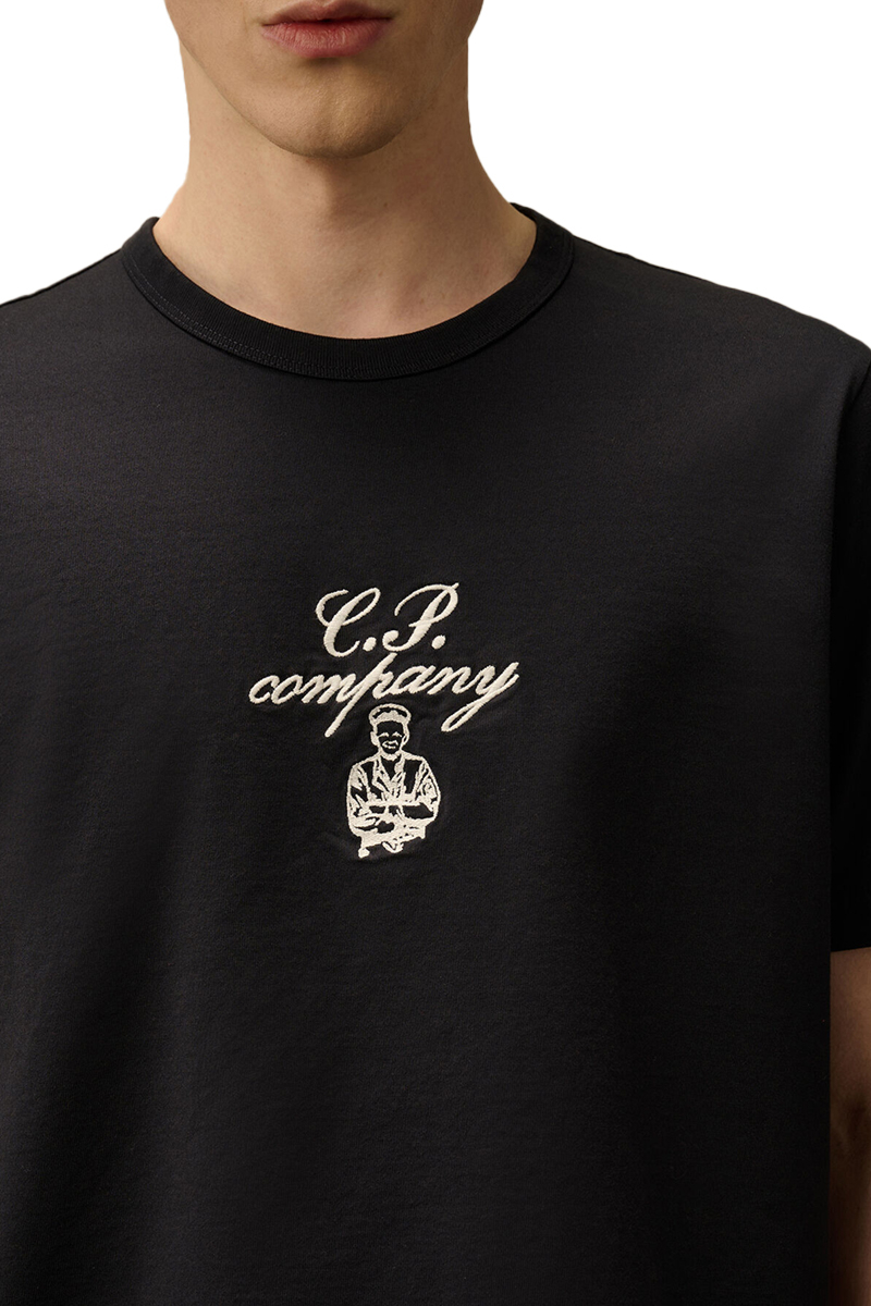 Dit T-shirt van C.P. Company heeft een klassieke ronde hals en korte mouwen. Het item is ontworpen in een diepblauwe tint. Op de voorkant bevindt zich een opvallende geborduurde logo-opdruk, bestaande uit een gestileerd merkembleem. De pasvorm is standaard en biedt comfortabele bewegingsruimte.