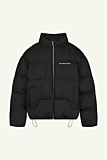 Gewatteerde jas in diepzwart. Standaard fit. Voorzien van een ritssluiting aan de voorzijde. Twee steekzakken en een opstaande kraag. Logo-opdruk op de borst. Verstelbare zoom met trekkoord.