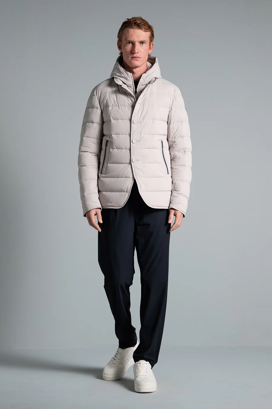 Lichte beige jas met gewatteerd design voor een moderne uitstraling. Slim fit. Voorzien van een afneembare capuchon en ritssluiting met knopen voor extra bescherming. Twee ruime zijzakken met rits, ideaal voor het veilig opbergen van kleine voorwerpen. Discreet logo op de mouw.