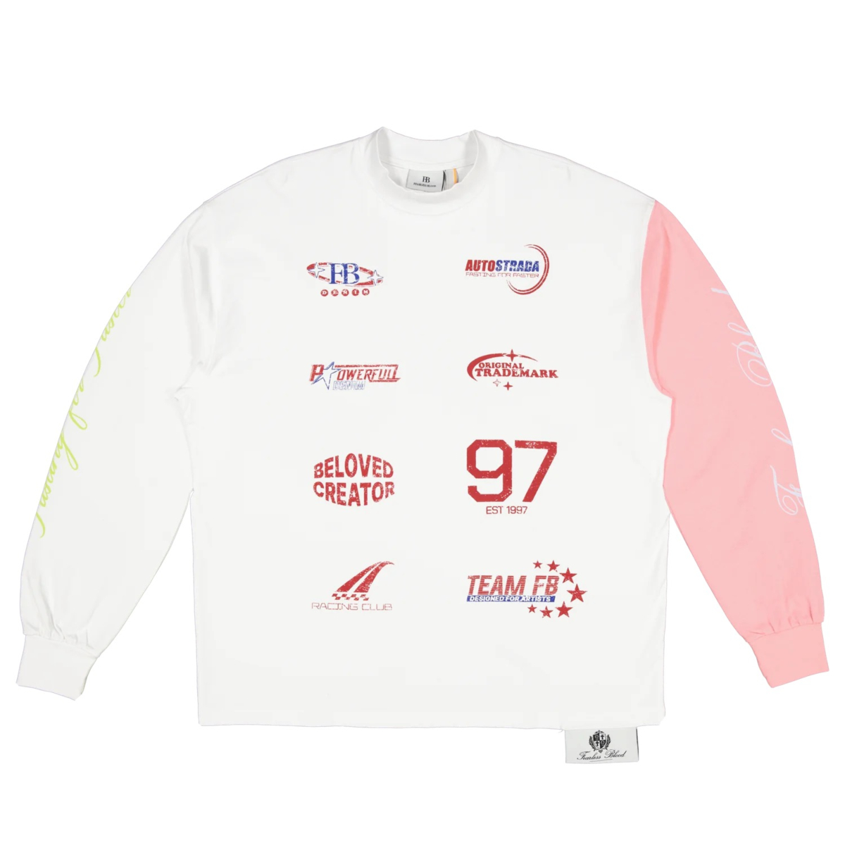 Witte sweater met opvallende opdrukken op de voorzijde, waaronder diverse logo’s en tekstdesigns. Relaxte pasvorm met lange mouwen, waarvan één in contrasterend roze. De tekst 'Fearless Blood' is subtiel afgedrukt langs de mouw. Ribboorden bij de manchetten en zoom. Het model is ideaal te combineren met casual jeans.