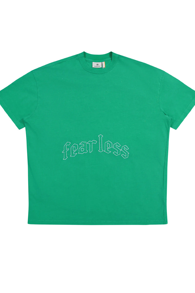 Dit groene Fearless Blood T-SHIRT FB-TEE-01 is gemaakt van zacht, hoogwaardig katoen. Het shirt kenmerkt zich door een moderne oversized pasvorm en is voorzien van de geborduurde 'fear less' tekst in een gotisch lettertype op de borst. Dit is een essentieel kledingstuk dat een krachtige, eigentijdse uitstraling garandeert.