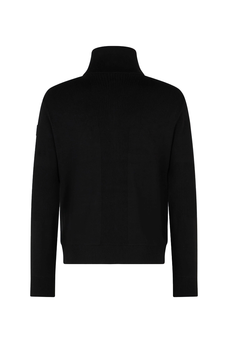 Moderne jas met geribde kraag en ritssluiting. Strakke pasvorm en minimalistisch ontwerp. Twee zijzakken met subtiele ritssluitingen en een embleem op de linkermouw. Geribde boorden aan de mouwen en zoom voor een nette afwerking. Kleur: zwart. Veelzijdig te combineren met diverse kledingstukken.