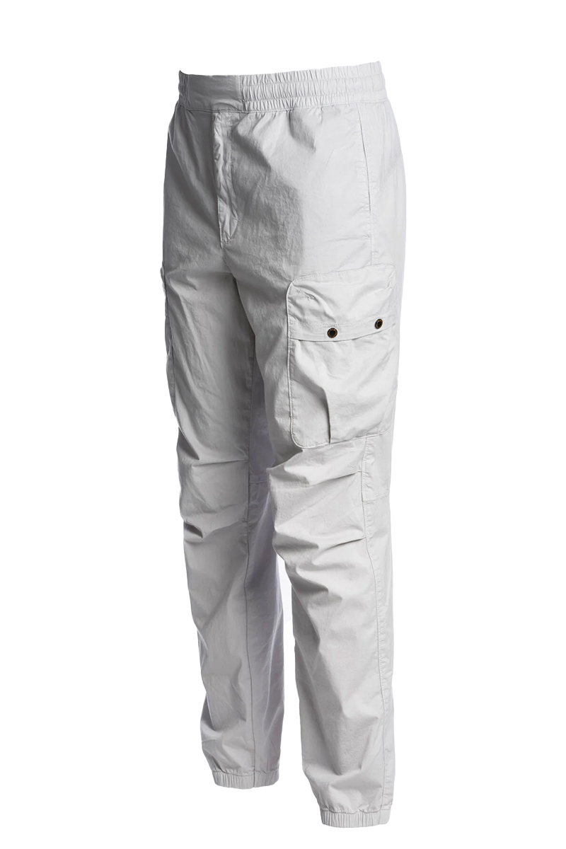 Lichtgrijs cargo pantalon met een moderne pasvorm. Voorzien van stevige elastische tailleband voor comfort en flexibiliteit. Uitgerust met meerdere zakken, waaronder twee zijzakken met knoopsluiting en twee achterzakken. De elastische boorden bij de enkels zorgen voor een aansluitende fit. Subtiele merkdetails zijn aanwezig op de zakken.