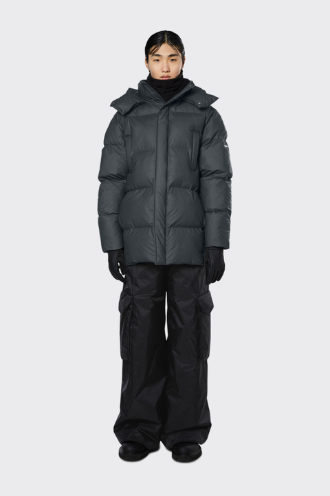 Boxy Puffer Parka uit de nieuwe RAINS collectie in een grijze kleur. Een geïsoleerde winterjas, gesneden uit een ademende en toch waterdichte PU-gecoate stof.