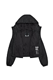 Korte geïsoleerde jas in een diepe zwarte kleur. Voorzien van een minimalistisch ontwerp met een functionele capuchon. De jas heeft een ritssluiting aan de voorkant en twee steekzakken met verborgen ritsen voor een strak uiterlijk. De mouwen zijn afgewerkt met elastische boorden voor een aansluitende pasvorm. Subtiel logo op de binnenzijde. Geschikt voor uiteenlopende weersomstandigheden dankzij de isolerende eigenschappen.