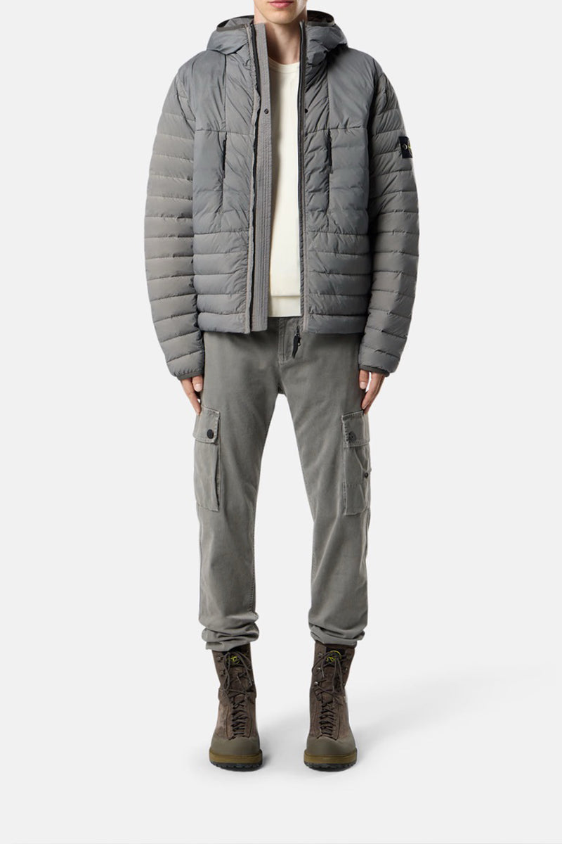 Grijze jas van Stone Island met een gewatteerd ontwerp en capuchon. De jas bevat een ritssluiting aan de voorkant en beschikt over meerdere zakken. De linkerarm is voorzien van het kenmerkende Stone Island embleem. Combineert goed met zowel casual als meer geklede outfits. Geschikt voor diverse weersomstandigheden.