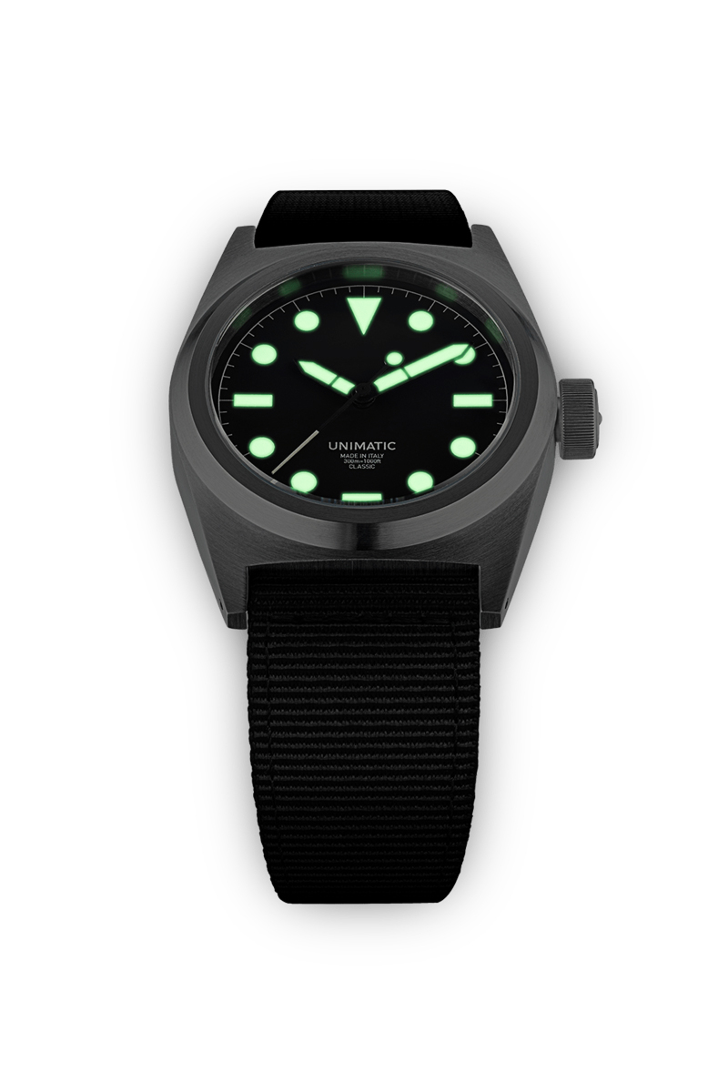 Nieuw bij Tip de Bruin: deze unieke Unimatic UC2 watch, onderdeel van de Unimatic Classic-serie. Unimatic maakt al jaren geweldige limited edition horloges met de perfecte functionaliteit! De classic UC2 is een unieke veldhorloge met een goed afleesbare wijzerplaat in mat zwart en Super-LumiNova® C3 lichtgroen markeringen. Het 2,7 mm dikke ultra dubbel antireflecterende saffierglas zorgt voor goed zicht in alle lichtomstandigheden. Door de kroon met een diameter van 8 mm is de classic UC2 waterbestendigheid tot 300m onderwater. De kast is gemaakt van 316 roestvrij staal met geborstelde afwerking, gegraveerd met het 'Rosa Dei Venti'-diagram. De UC2 heeft een zwarte nylon tweedelige band met roestvrijstalen geborstelde gesigneerd Unimatic frame.