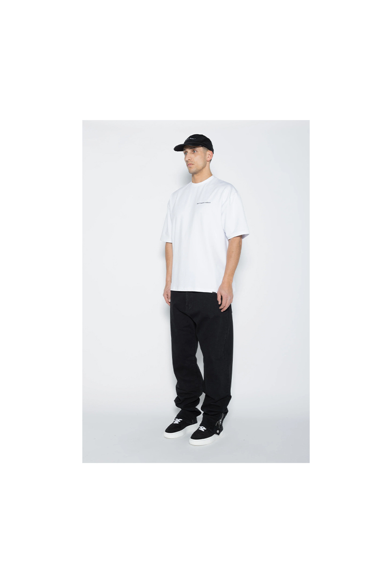 Rechte jeans in klassiek zwart. Voorzien van vijf zakken en ritsgulp. Metalen knoop en klinknageldetails voor duurzaamheid. D-ring detail aan de enkel. Discreet merklabel op de achterzak. Subtiel logo op de tailleband.